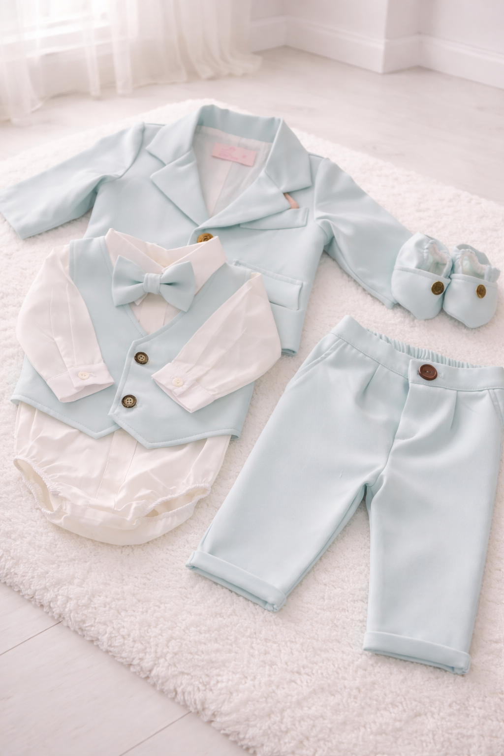 Transformă botezul într-un eveniment de poveste cu acest costumaș sofisticat, creat special pentru băieței eleganți. Designul impecabil și materialele premium oferă un look distins și confortabil!