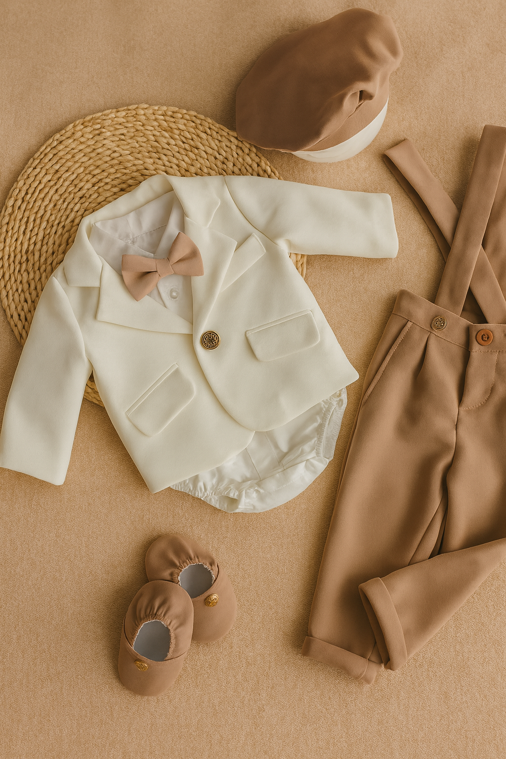 - Costumas botez Carol: sacou, pantalon cu bretele, camasuta tip body, bascuta, botosei, papion.
