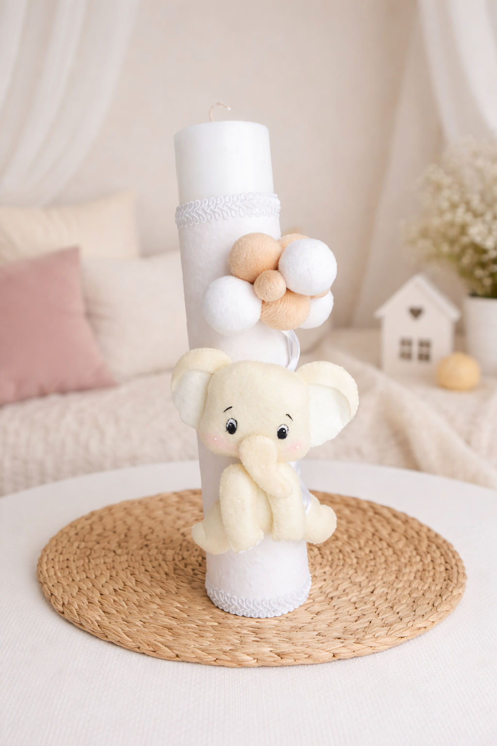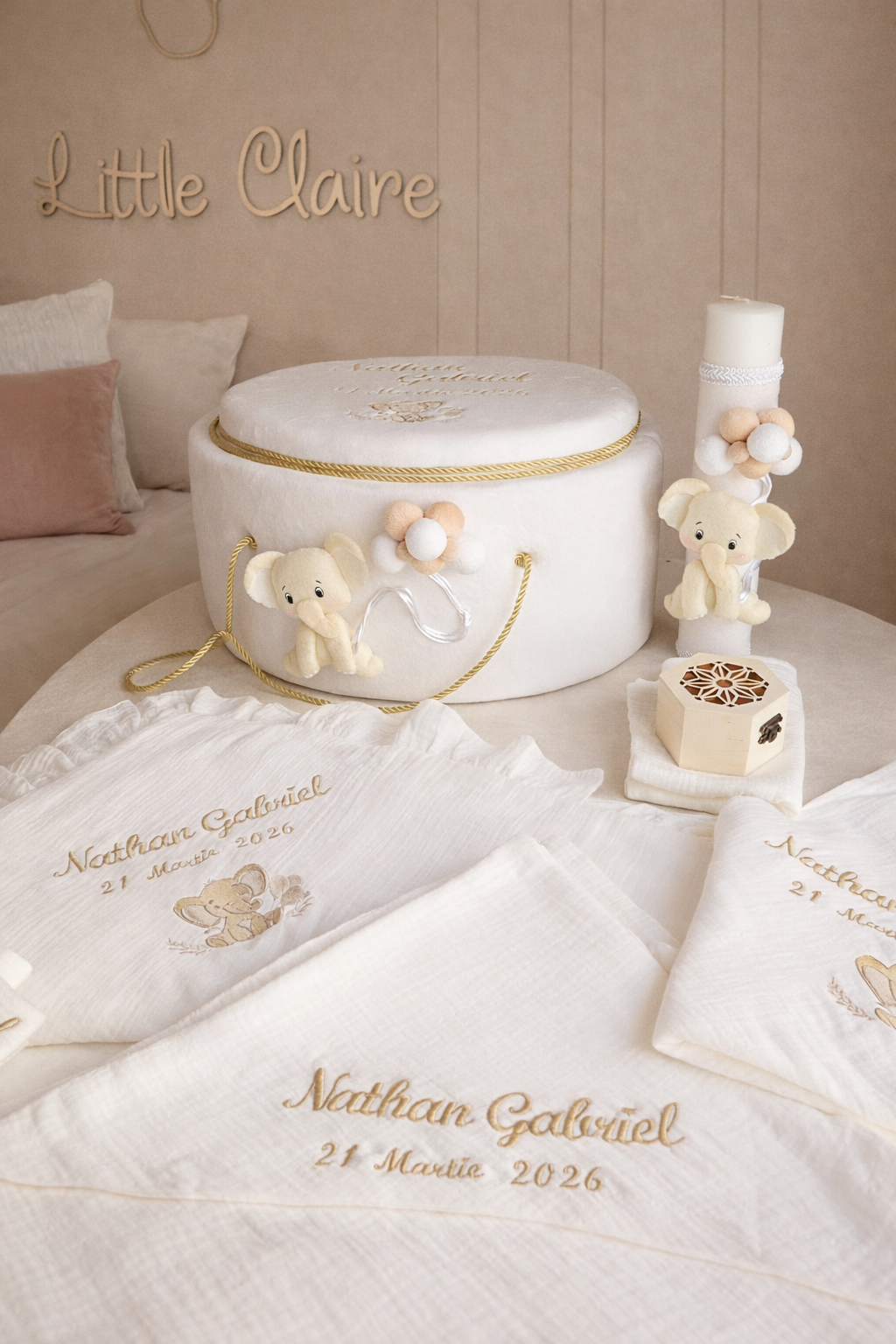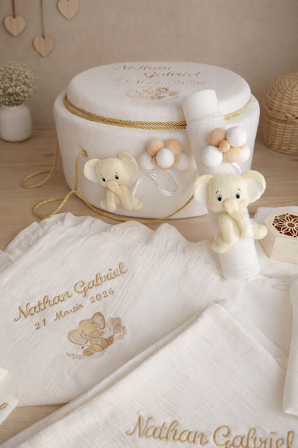 - cufar personalizat, imbracat in catifea si decorat cu elefantel din fetru si baloane din catifea