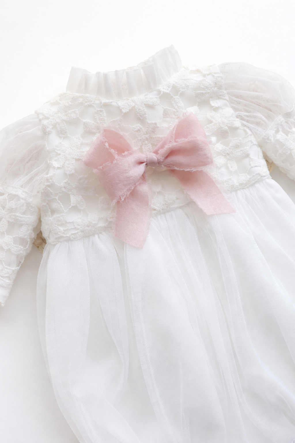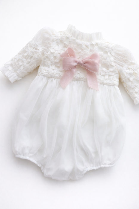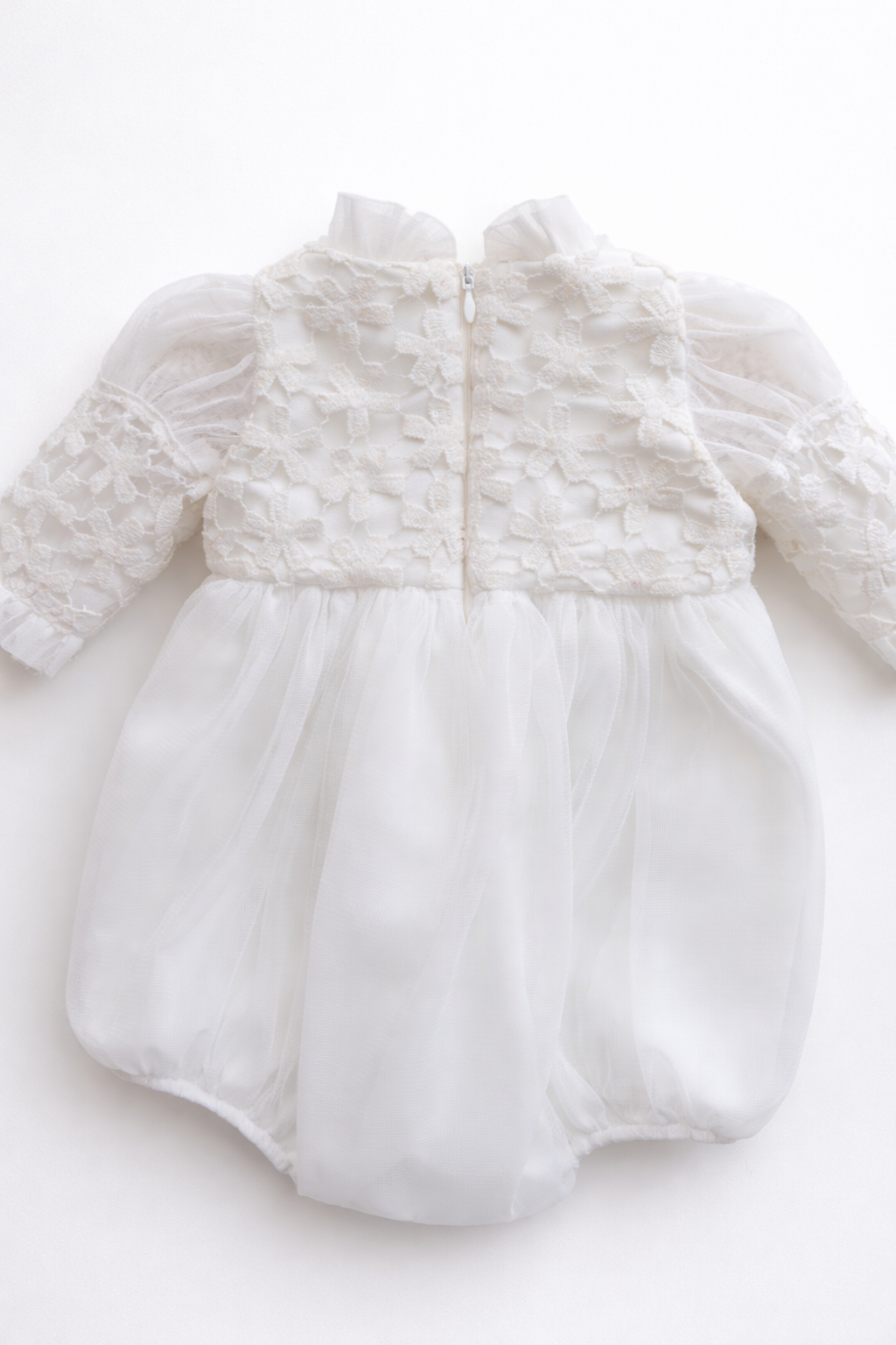 Realizat din crep fin de calitate, body-ul este completat de valuri vaporoase de tull, care creează volum și eleganță. Bustul este căptușit cu bumbac moale, pentru confort maxim pe pielea sensibilă a bebelușului, iar exteriorul este decorat cu dantelă florală delicată, ce adaugă un aer romantic și sofisticat.