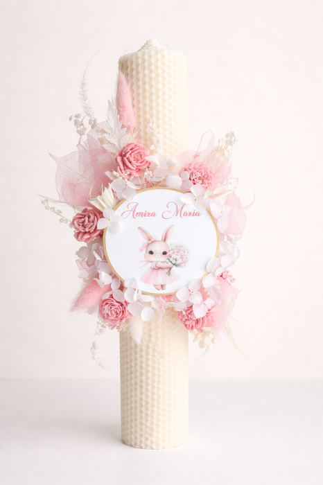 Lumanare din ceara naturala, decorata cu flori artificiale, personalizata dupa preferinte.