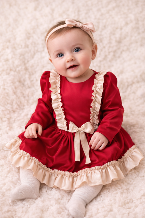 Nuanțele de roșu și crem o fac o alegere perfectă pentru acest sezon festiv, iar volanele adorabile adaugă un aspect jucăuș întregii ținute.