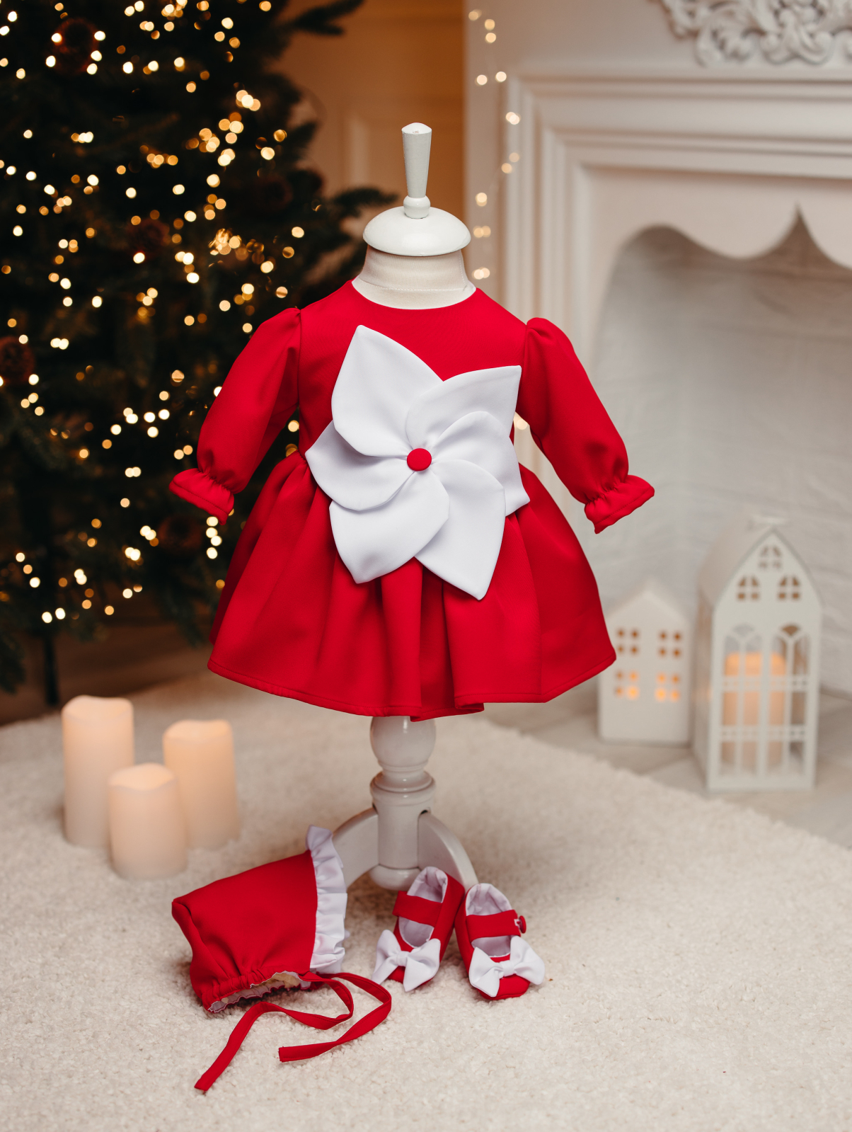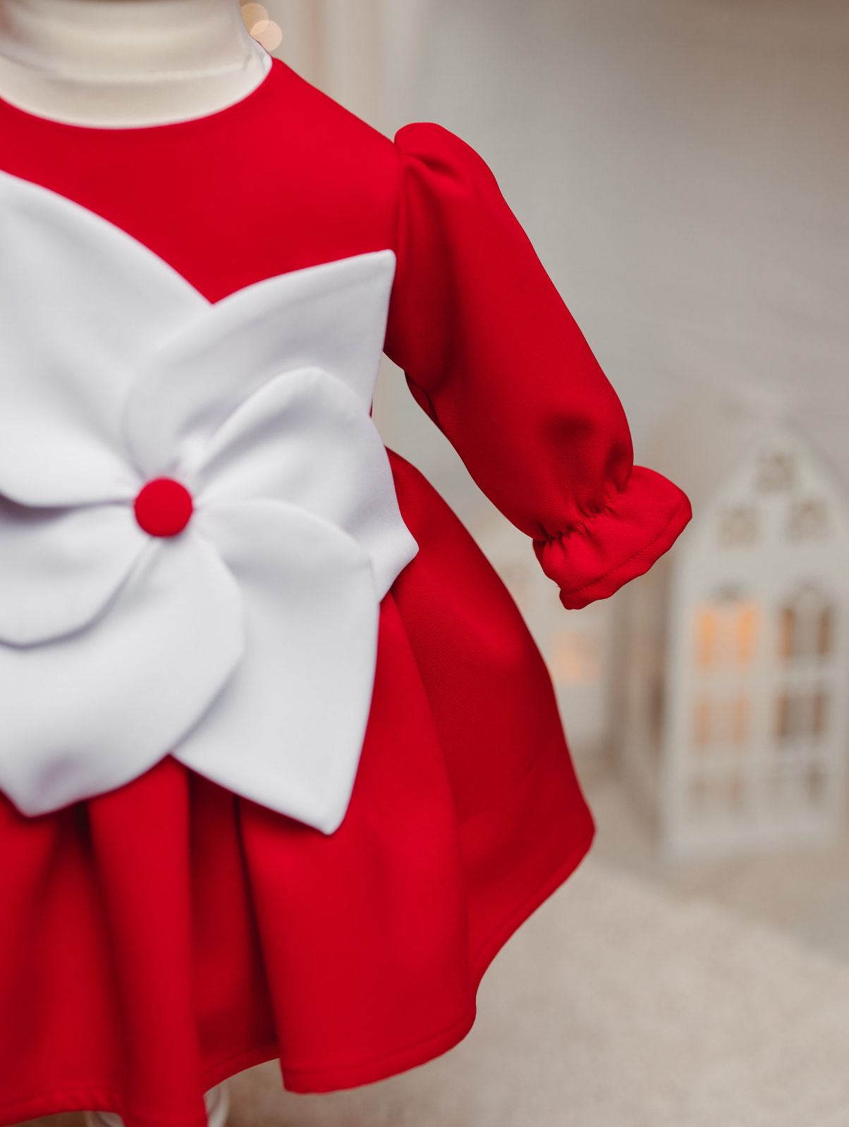 Rochița Stella îmbină farmecul clasic al roșului intens cu delicatețea detaliilor albe, transformând fiecare apariție într-o amintire prețioasă.