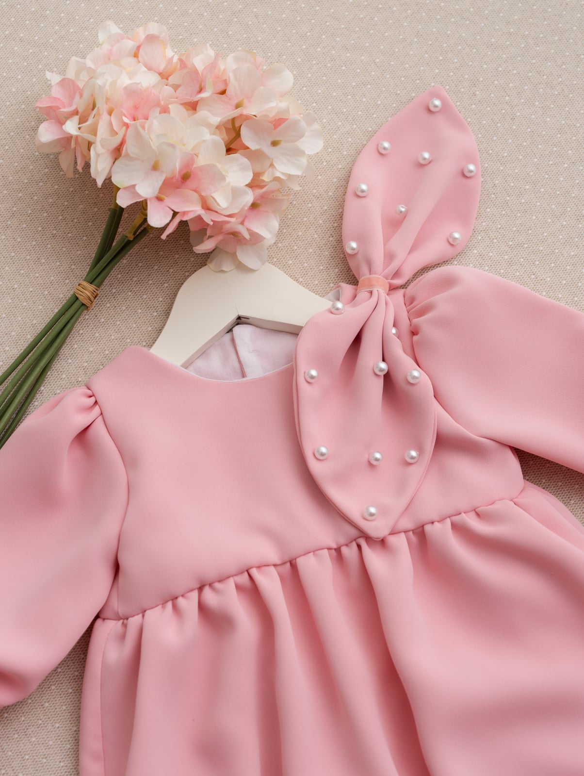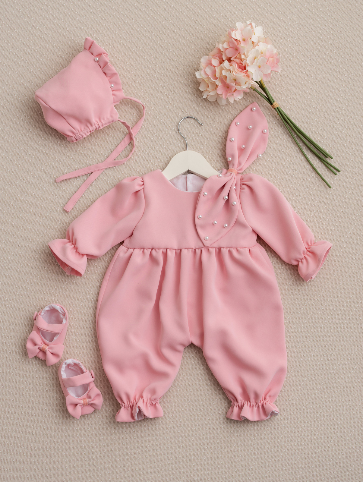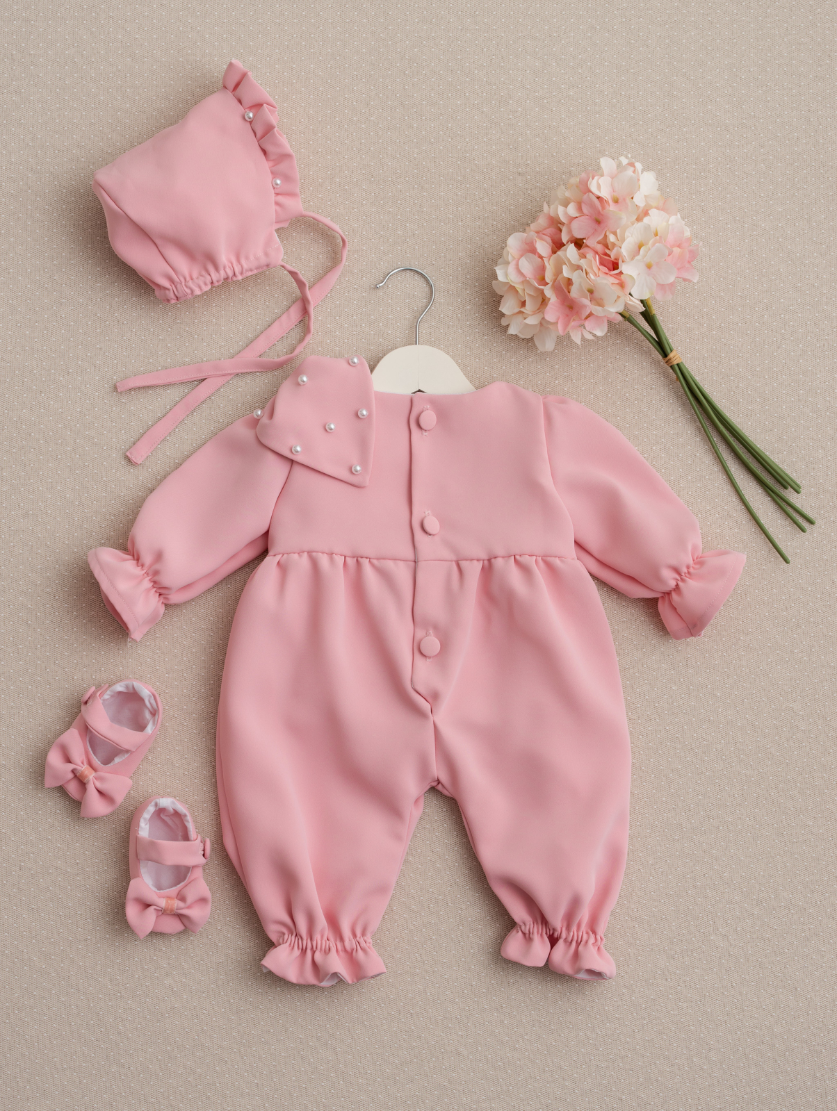 Această superbă salopetă de botez, realizată în nuanța rafinată de roz pudrat, este alegerea ideală pentru micuțele prințese care își vor face apariția într-o zi atât de specială. Croiala lejeră și modernă oferă confort deplin, iar detaliile atent lucrate aduc un plus de farmec: volănașe fine la mâneci și la baza pantalonilor, material mătăsos la atingere și o fundiță delicată accesorizată cu perluțe pentru un efect prețios.
