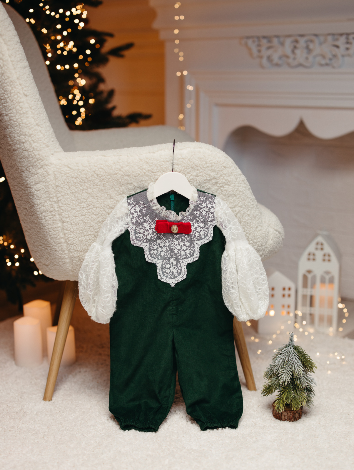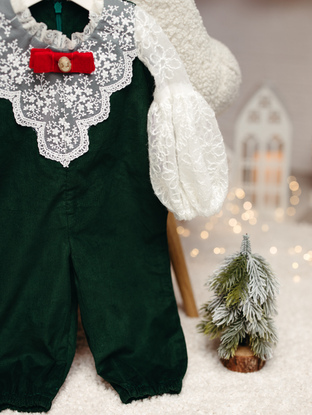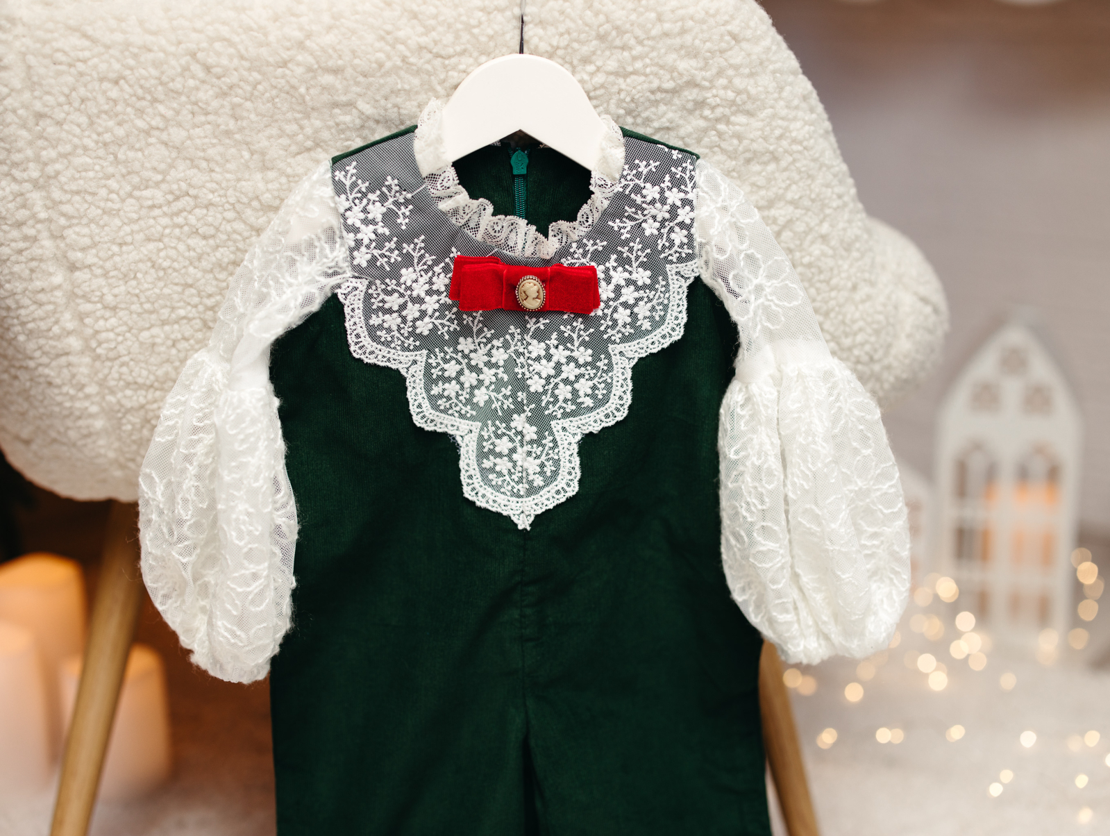 Salopetica Esme imbina catifeaua moale verde-smarald cu dantelă albă delicată și accente roșii, într-un design plin de rafinament și căldură.