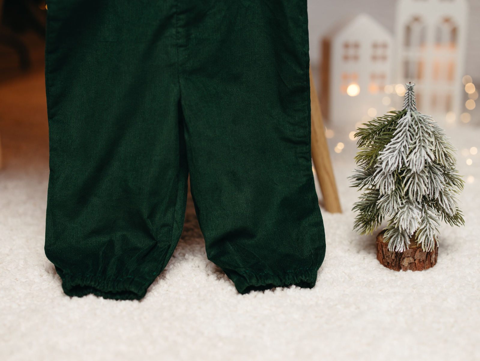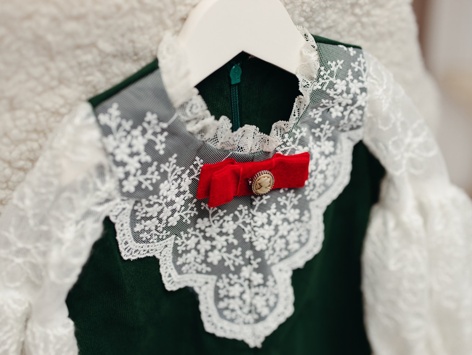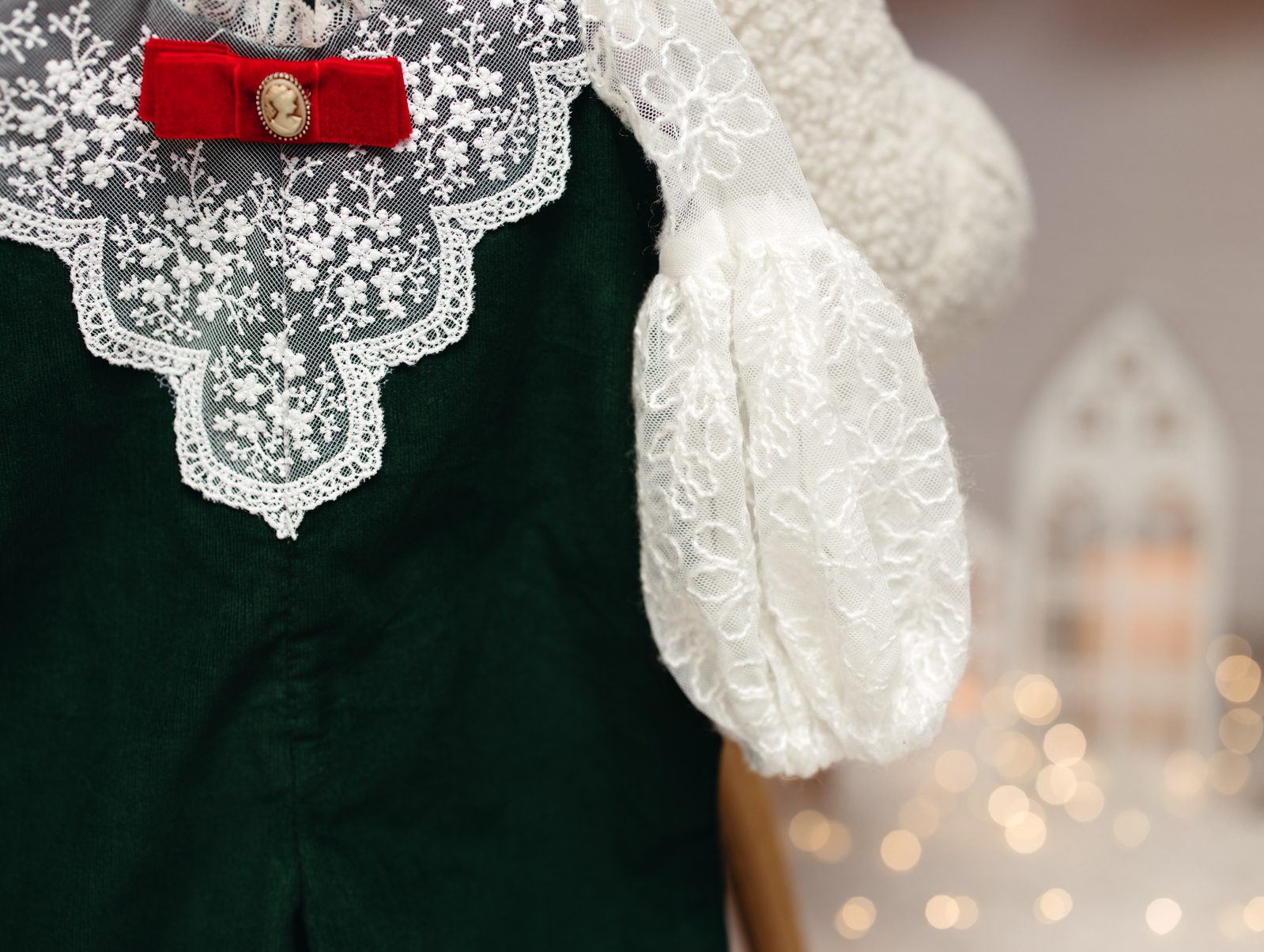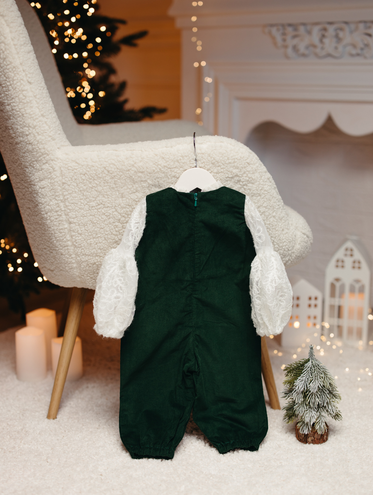 Salopetica Esme imbina catifeaua moale verde-smarald cu dantelă albă delicată și accente roșii, într-un design plin de rafinament și căldură.