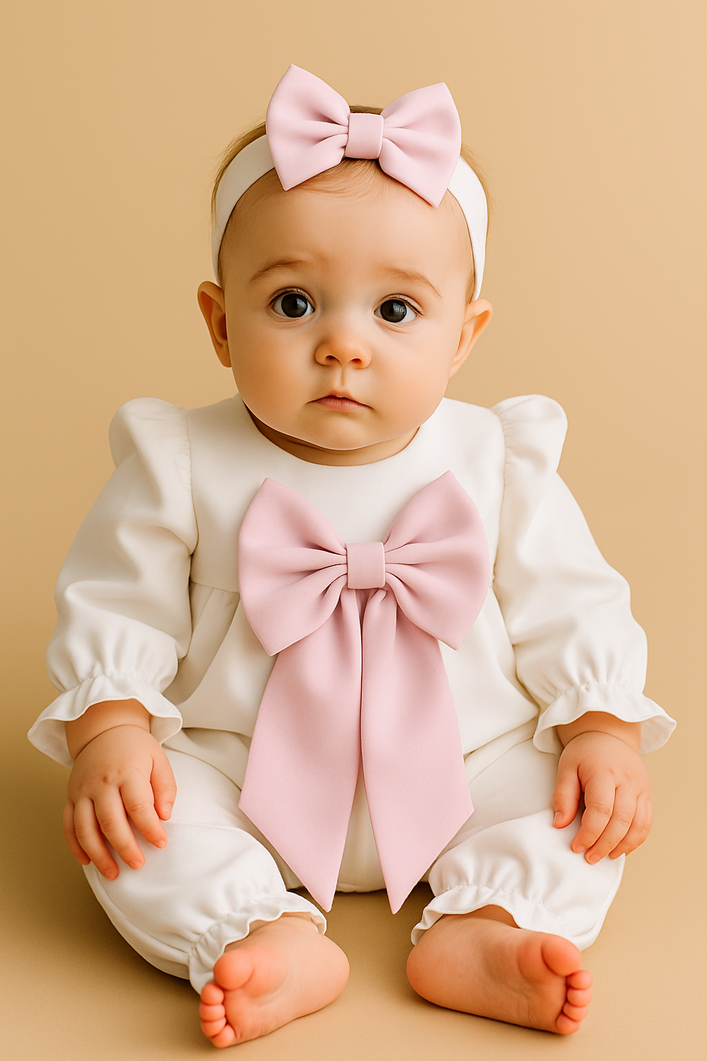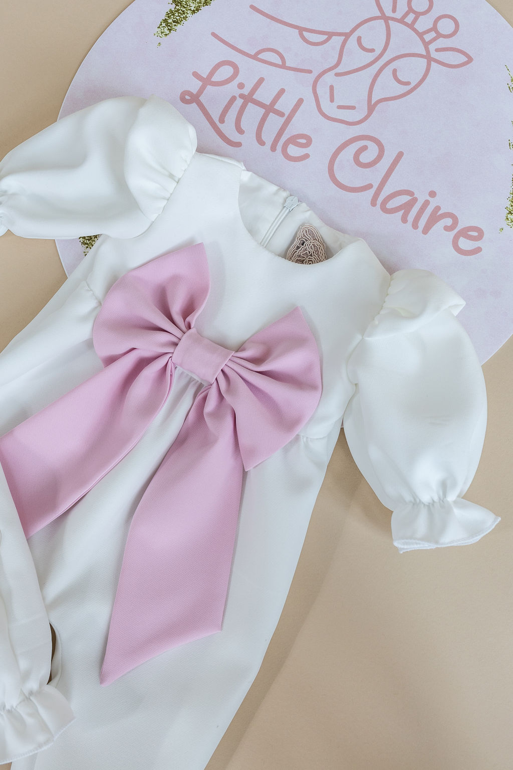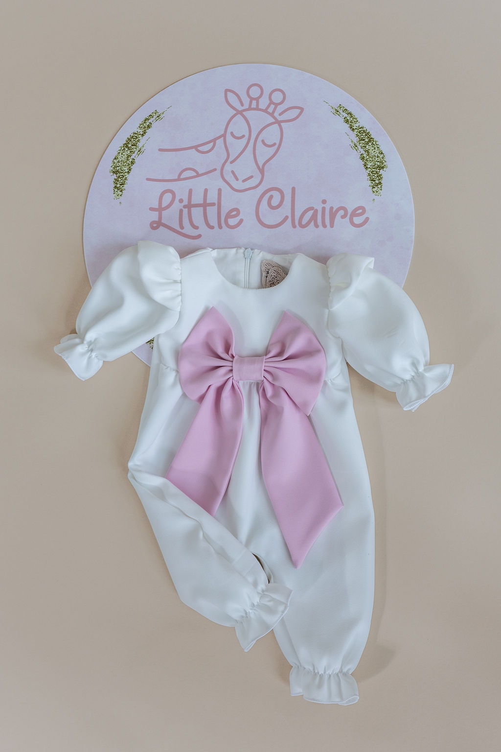 Modelul se remarcă prin croiala sa fină, mânecuțe bufante și o fundiță supradimensionată în nuanță de roz baby, amplasată în față – detaliu ce adaugă un farmec unic și un aer de prințesă.