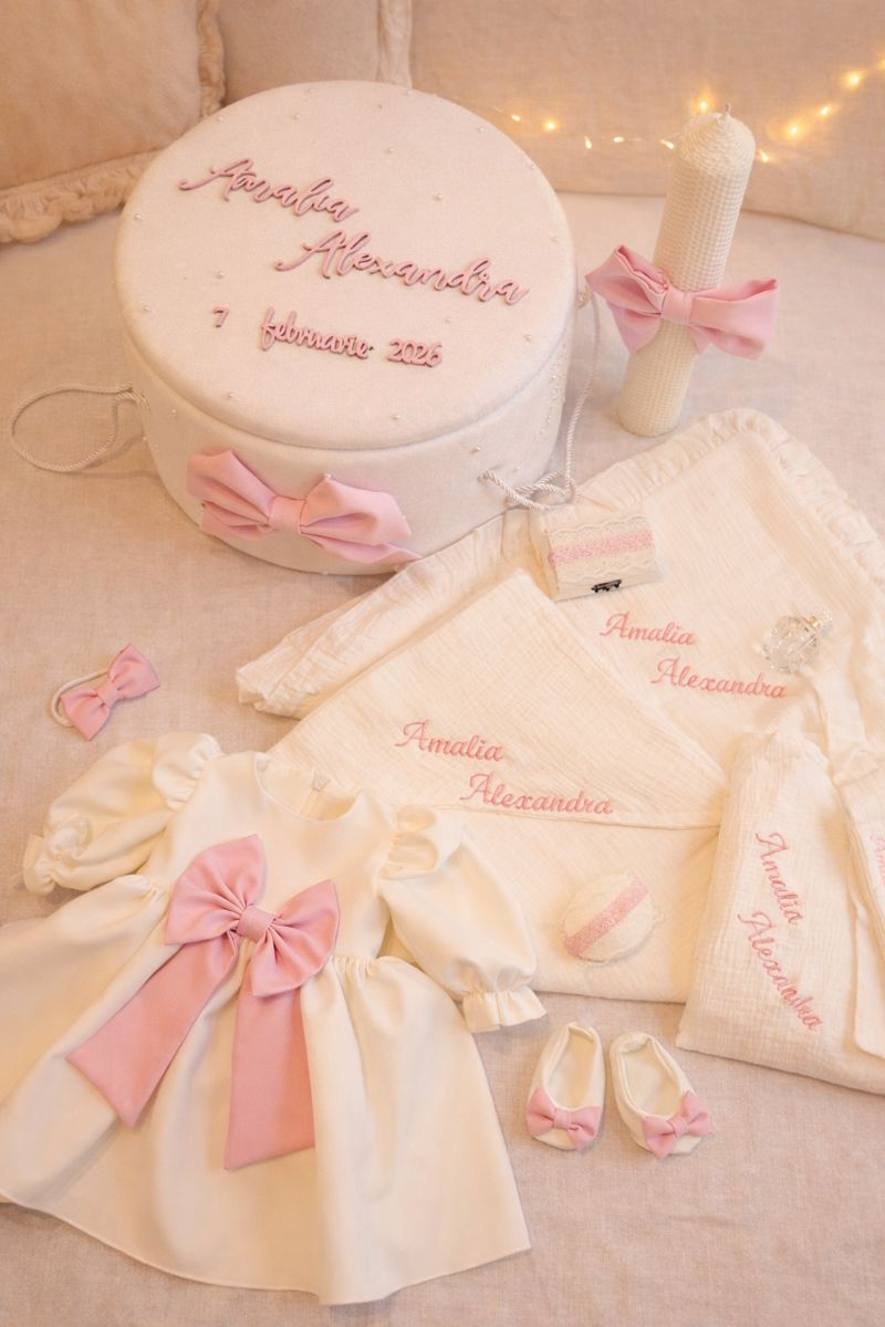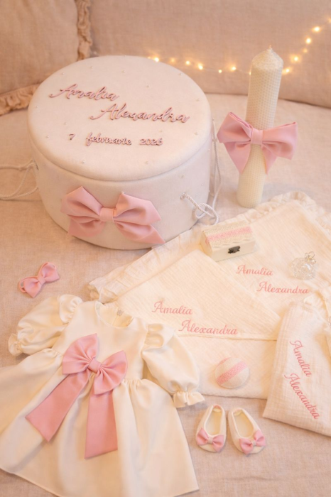 Acest set de botez personalizat pentru fetiță este alegerea perfectă pentru părinții care își doresc eleganță, calitate premium și un design atemporal, potrivit atât ceremoniei religioase, cât și ședințelor foto.