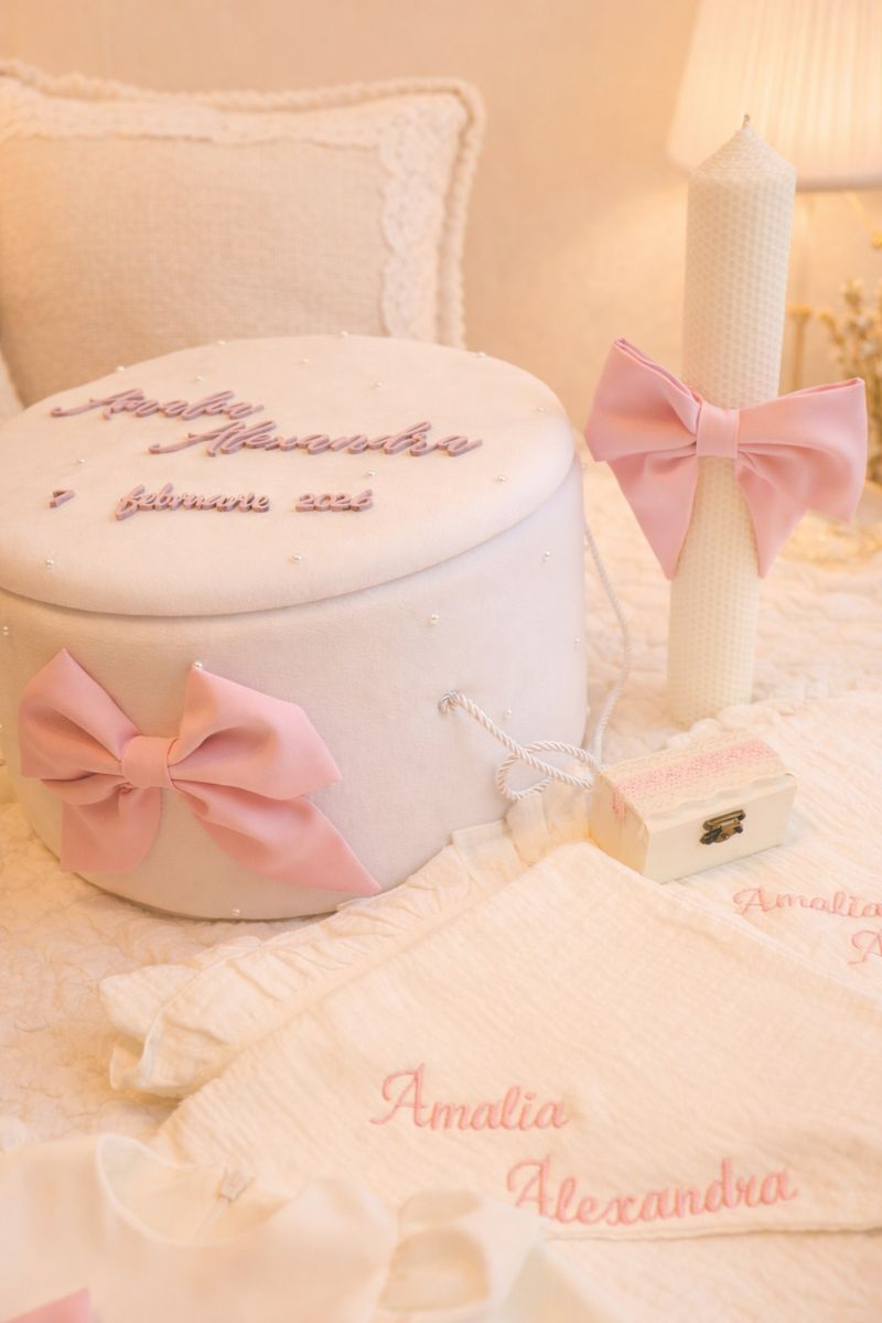Pentru păstrarea amintirilor prețioase, setul include un cufăr de botez personalizat, decorat manual cu perle fine și fundiță delicată, ideal pentru depozitarea obiectelor de suflet din această zi specială.