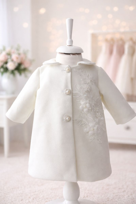 Ideal pentru botez, acest paltonaș elegant este realizat din stofă premium, căptușit cu bumbac moale pentru un confort desăvârșit. Decorat cu detalii fine de dantelă și nasturi tip perlă, oferă un aer sofisticat și delicat, perfect pentru o zi atât de specială. Un articol vestimentar de poveste pentru momente unice!