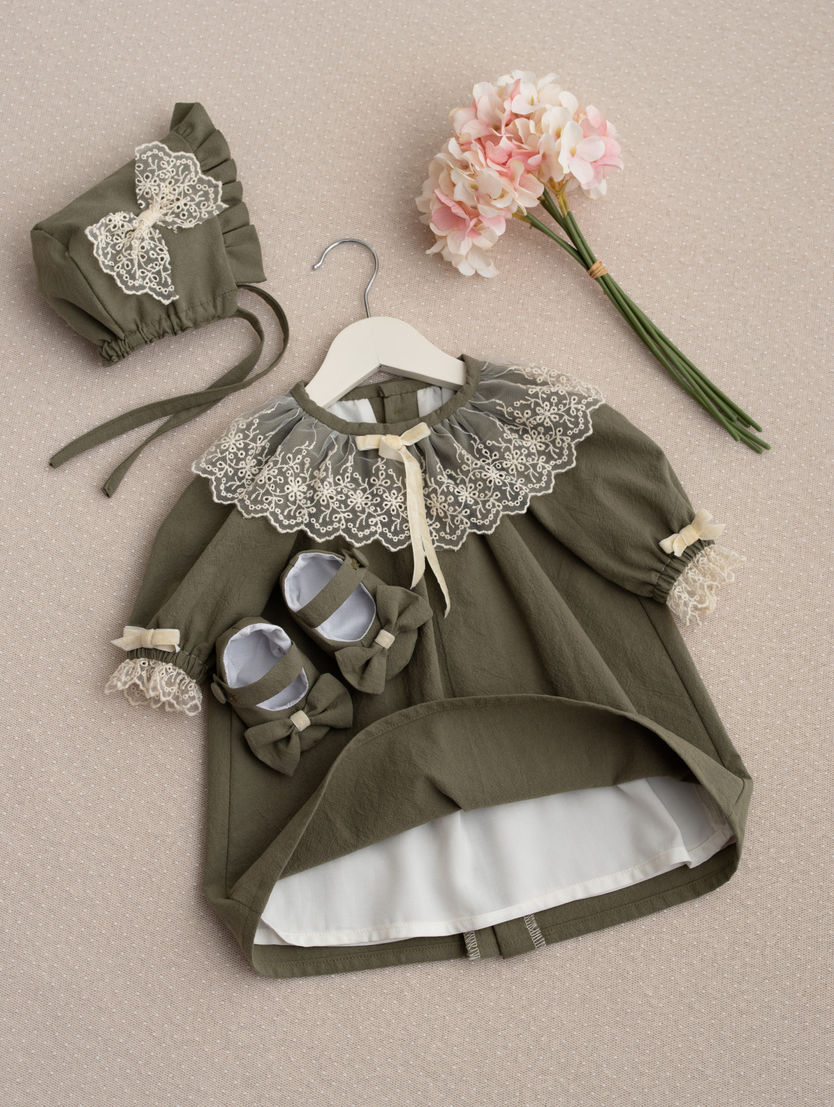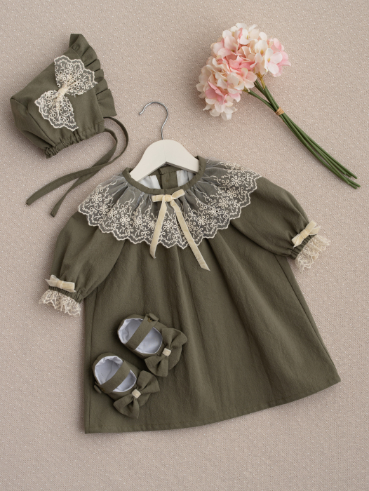 Elegantă și delicată, această rochiță pentru fetiță este realizată din bumbac prespălat, un material natural, moale și respirabil, ideal pentru pielea sensibilă a bebelușului. Nuanța rafinată de verde olive oferă un aer atemporal, perfect pentru un stil modern cu accente vintage.