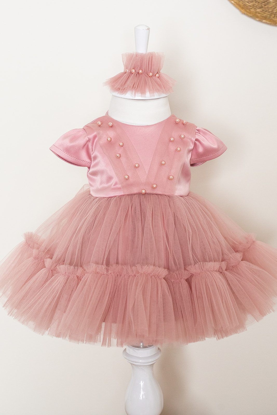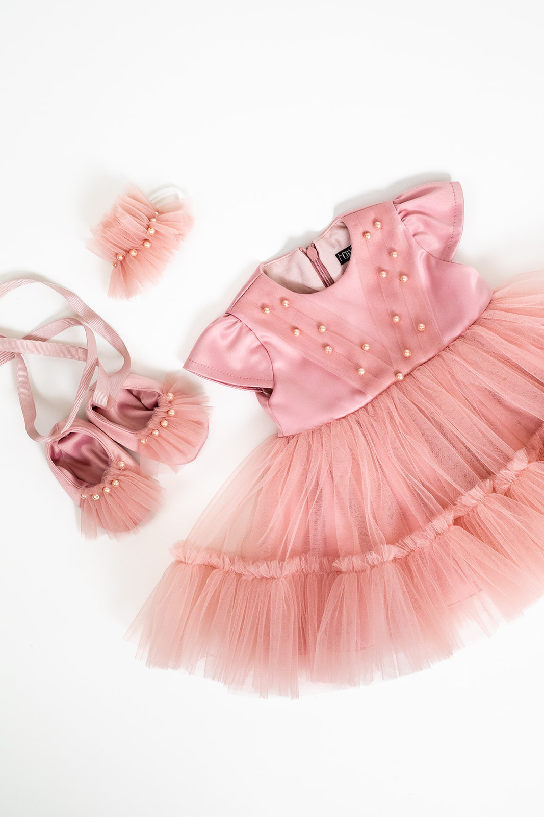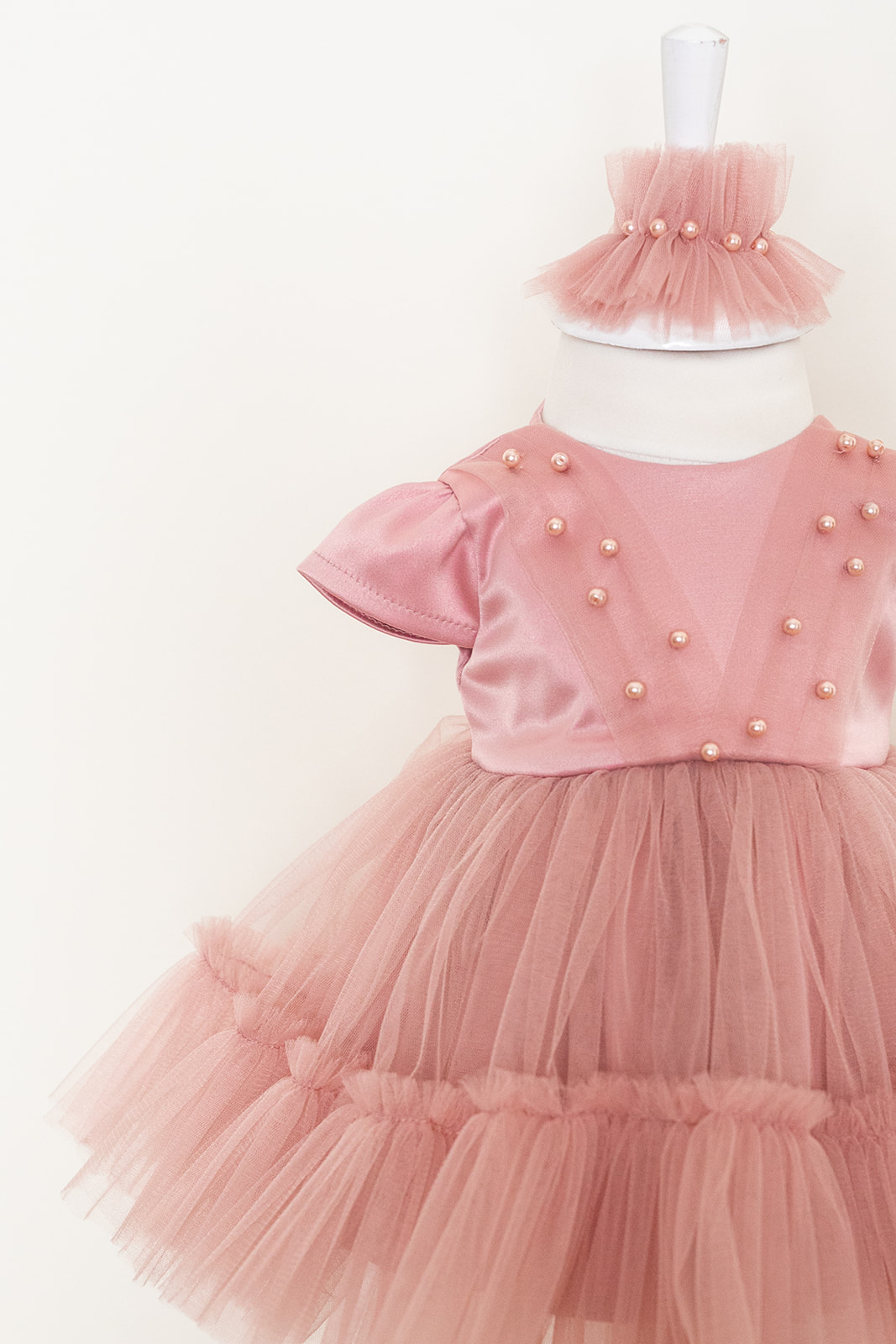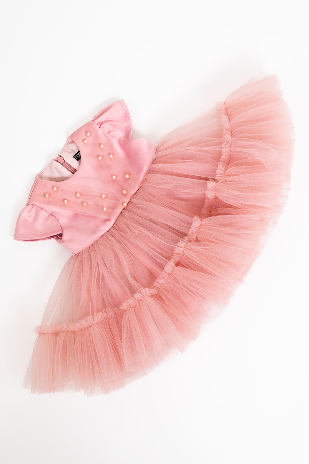 Detaliile cu perle delicate de pe bust adaugă un strop de strălucire și glamour, care completează cu eleganță designul general al rochiței.