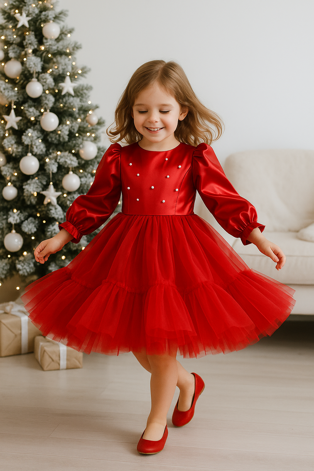 Rochița este accesorizată în partea de sus cu perluțe delicate, cusute manual.