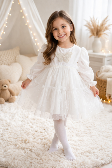 Transformă fiecare zi într-o ocazie specială pentru micuța ta prințesă! Comandă acum rochita noastră albă din tulle cu buline și adaugă un strop de magie și eleganță în garderoba micuței tale.