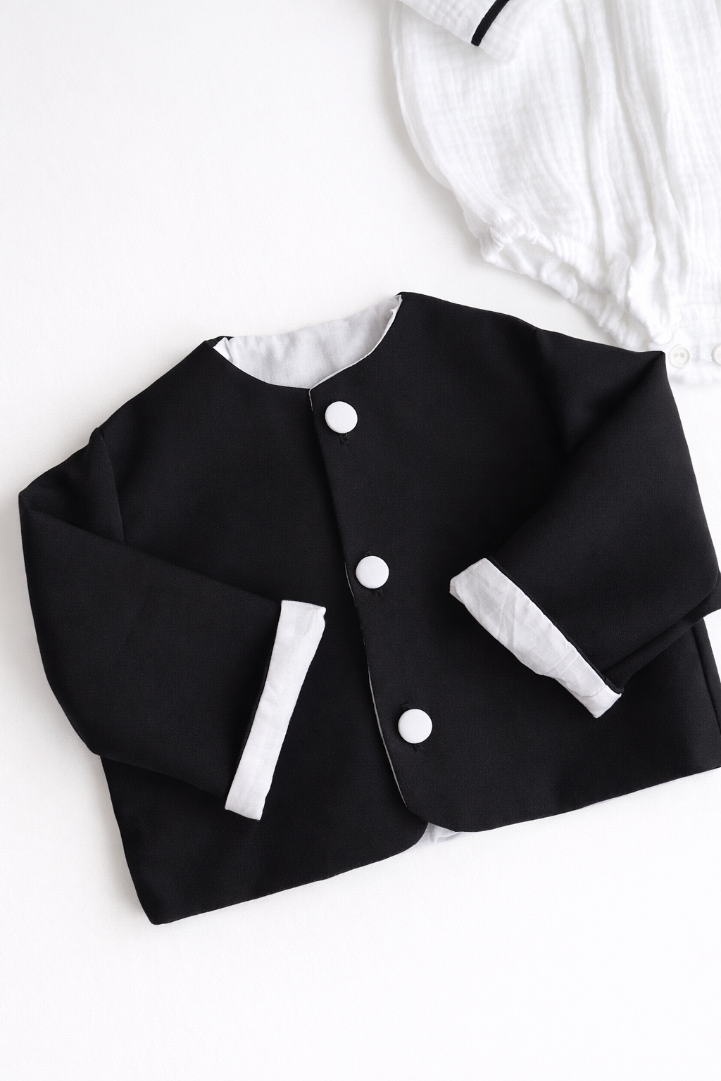 Un costum de botez elegant, cu aer clasic și rafinat, creat pentru momentele speciale din viața micuțului tău. Modelul Matteo Black impresionează prin combinația dintre pantalonii cu bretele din stofă elastică premium și cămașa tip body din muselină fină, delicată pentru pielea bebelușului.