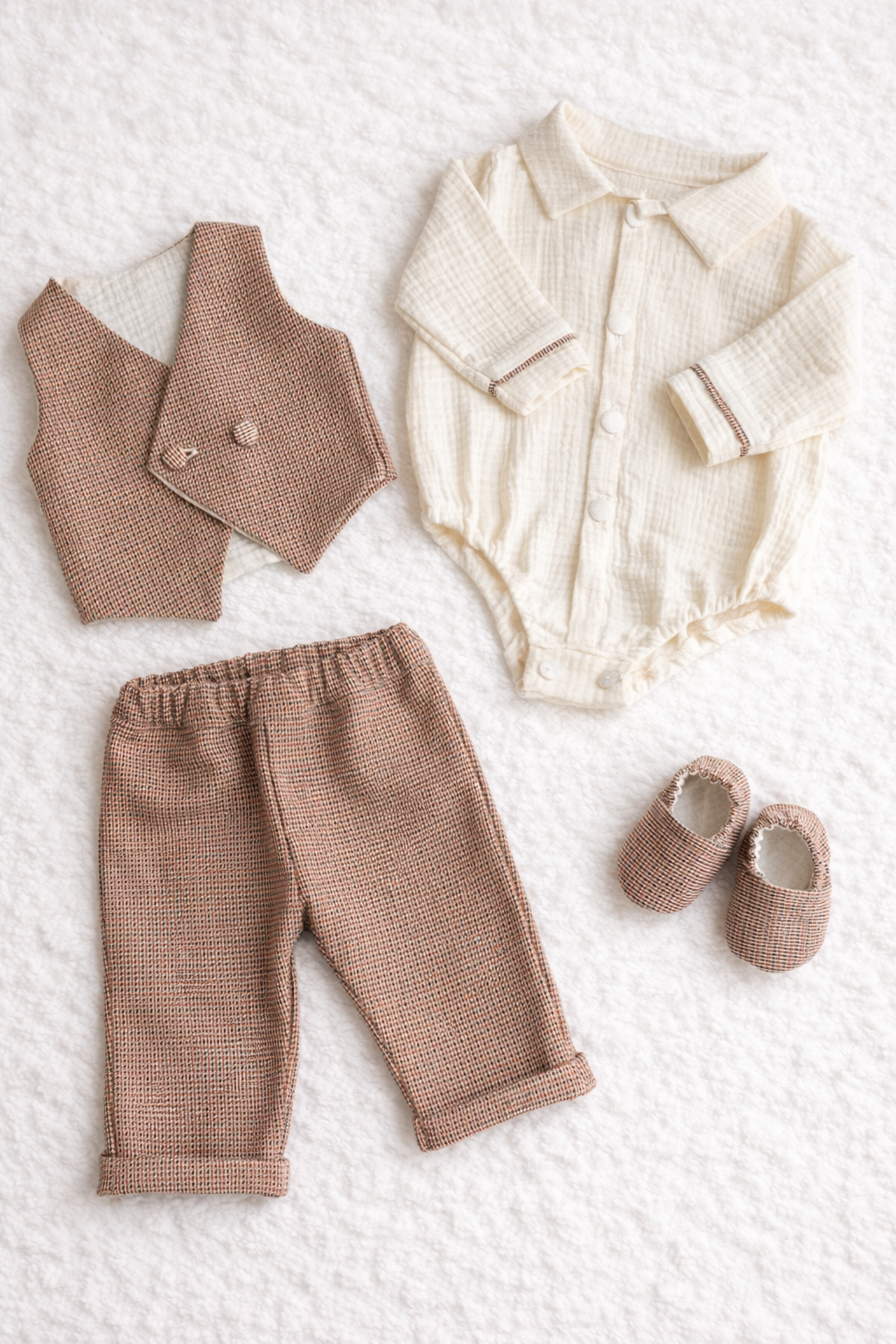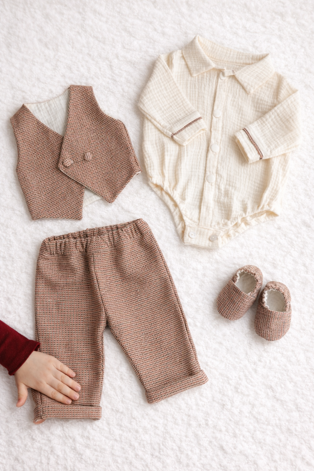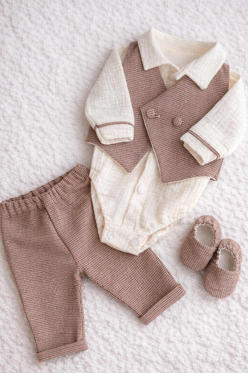 Un costum de botez elegant și rafinat, creat special pentru un moment unic. Modelul Sebastian Grena impresionează prin combinația nobilă dintre stofa premium în carouri grena și cămașa tip body din muselină fină, oferind un look sofisticat, dar delicat pentru pielea bebelușului.