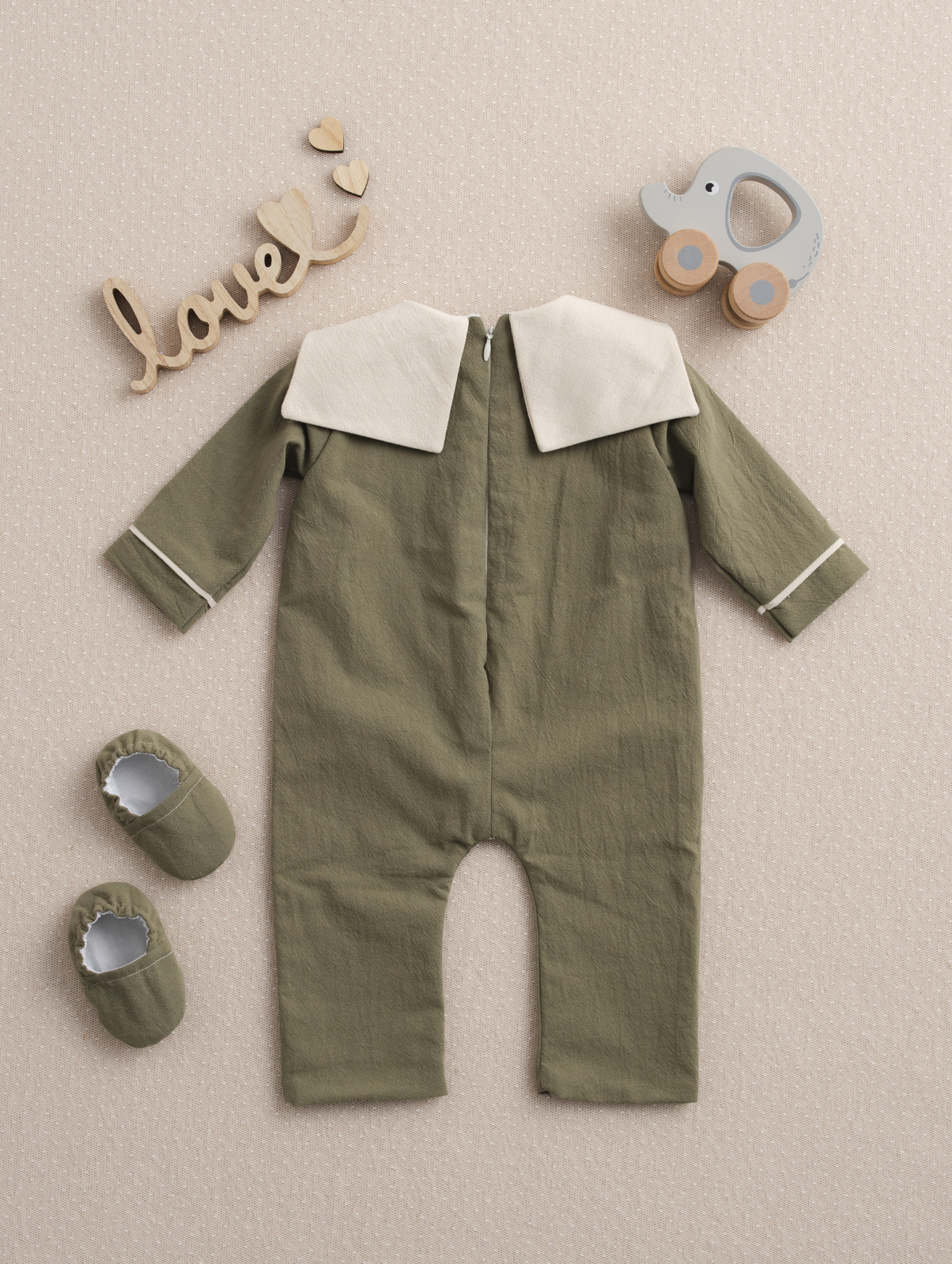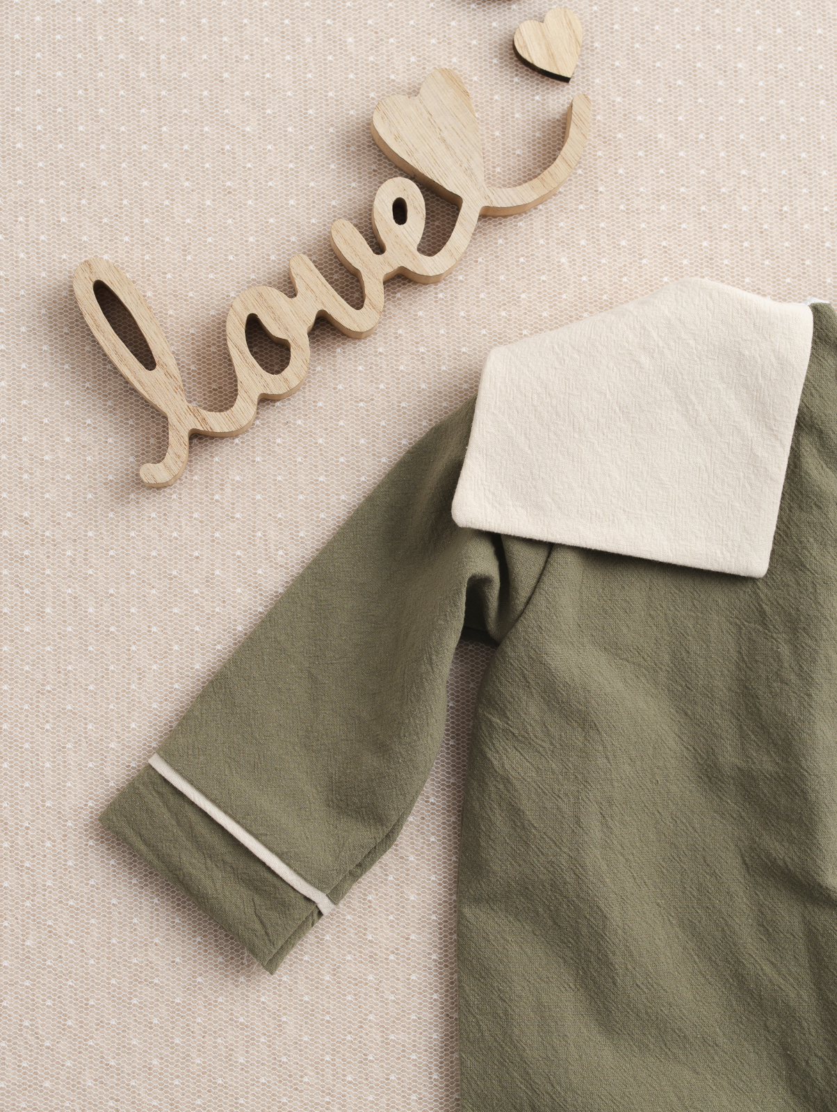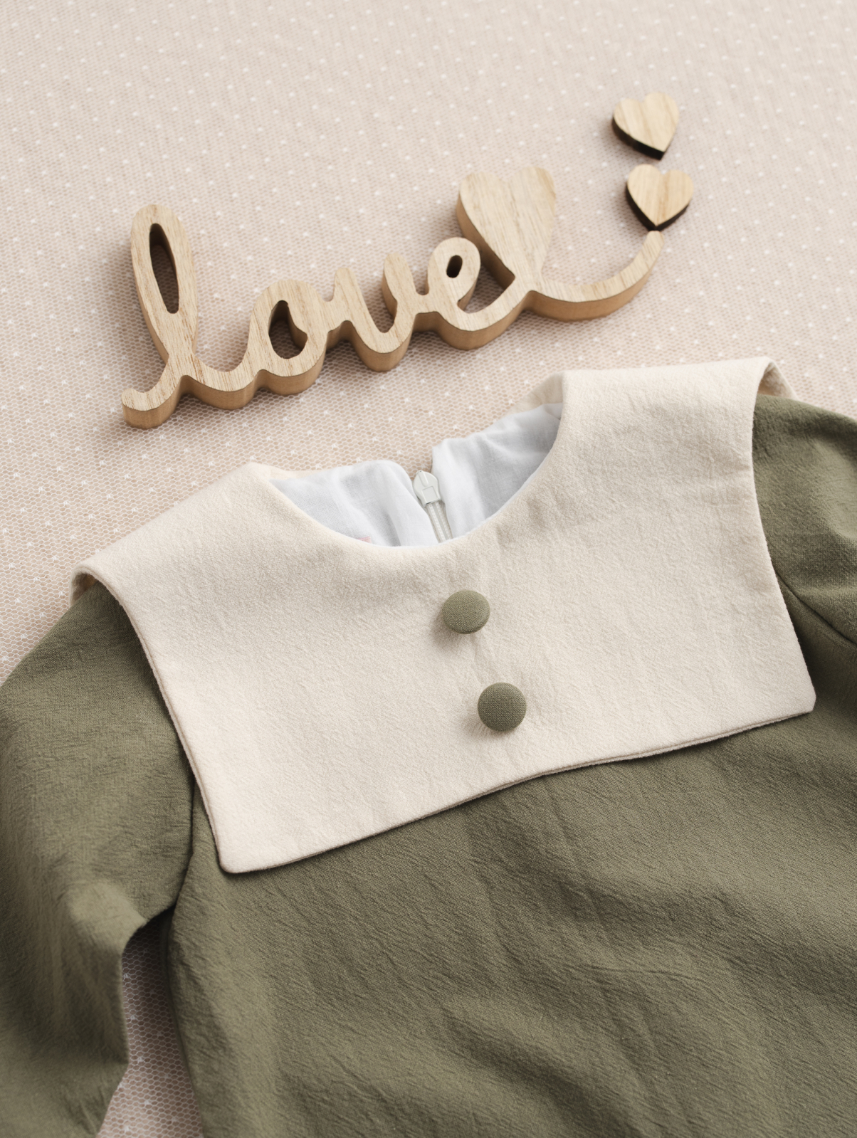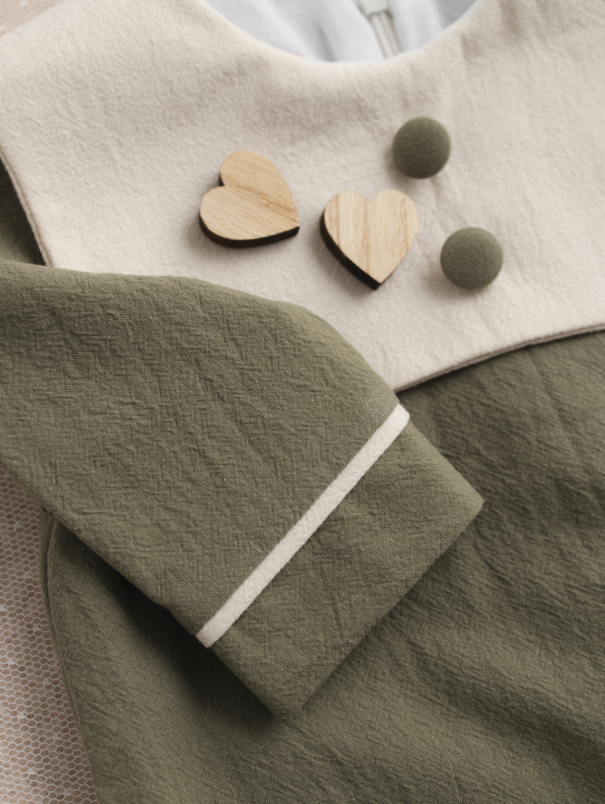 Designul modern, în nuanță olive natural, este completat de un guler contrastant și nasturi decorativi care adaugă un plus de eleganță ținutei. Croiala lejeră permite libertate de mișcare, iar materialele atent alese asigură confort pe tot parcursul evenimentului.