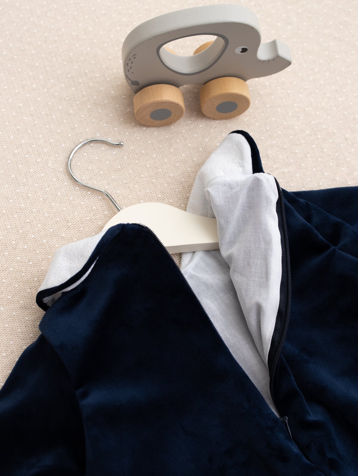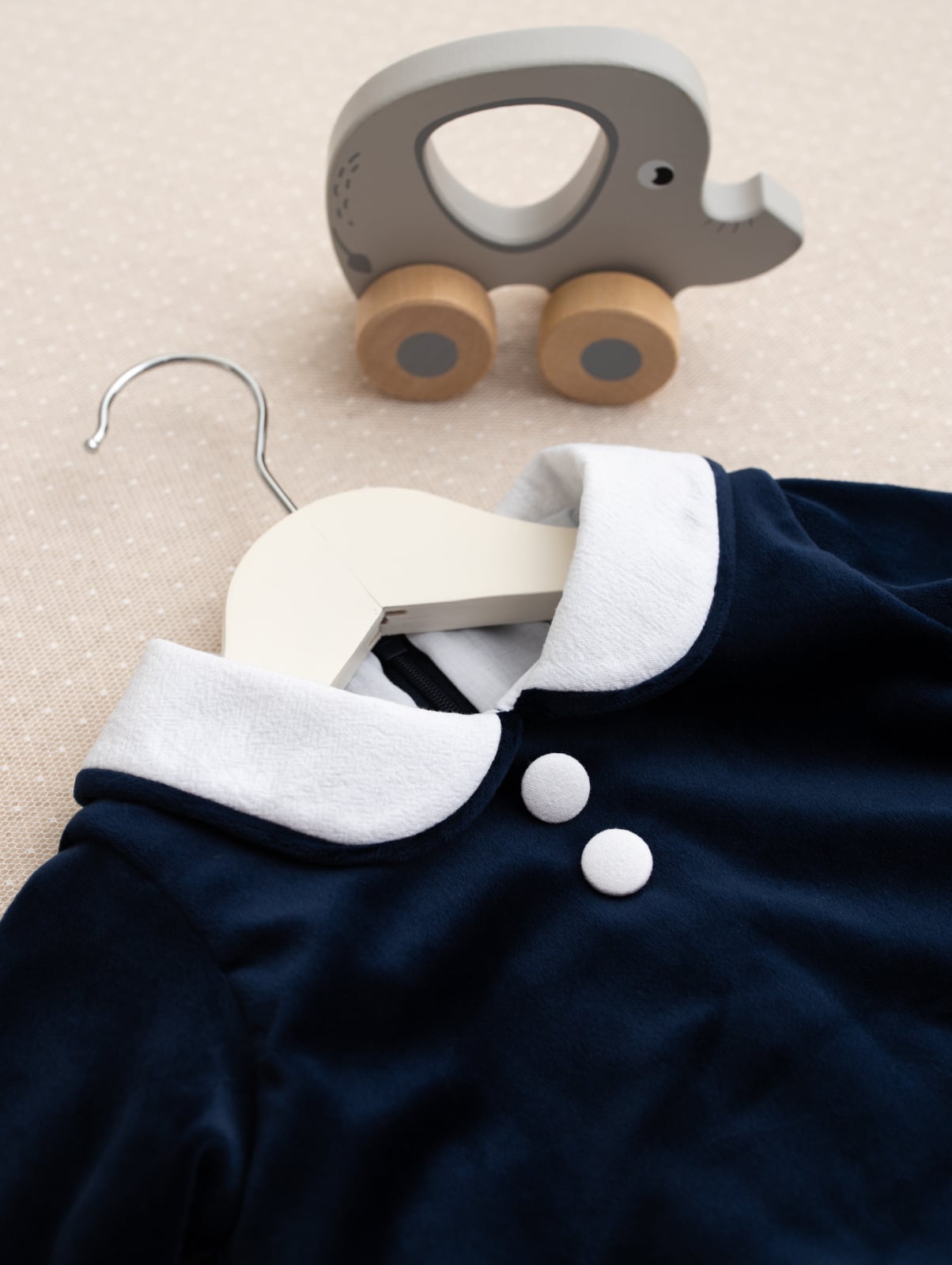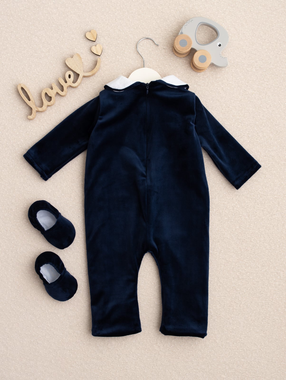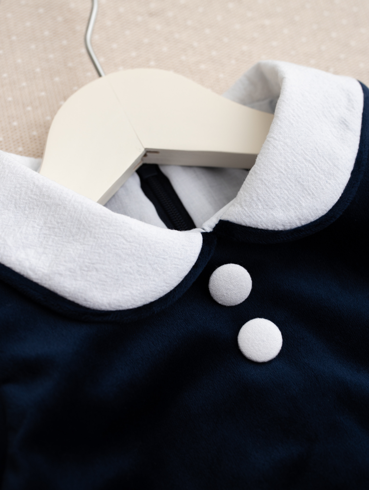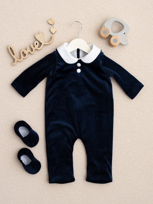 Confecționată din catifea moale și fină, salopetica este căptușită integral cu bumbac 100%, asigurând o senzație plăcută pe pielea sensibilă a bebelușului. Designul clasic, cu guler alb elegant și nasturi decorativi, oferă un aer sofisticat, perfect pentru evenimente speciale precum botezuri, aniversări sau ședințe foto.