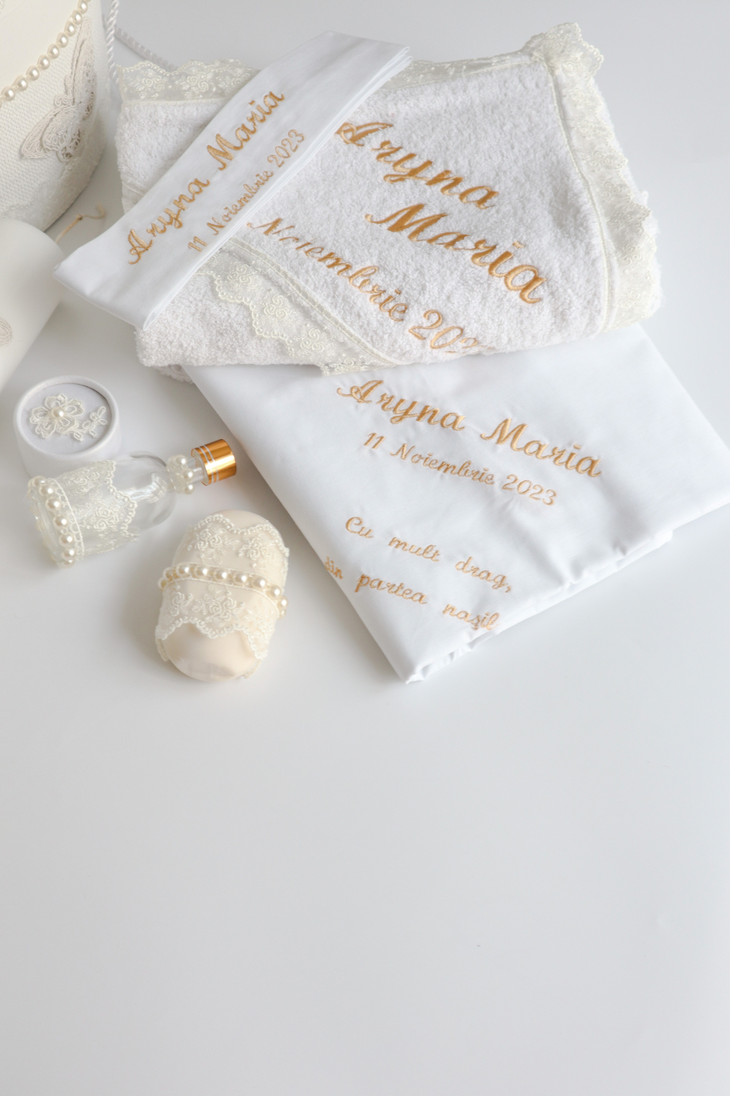 Setul include toate articolele tradiționale necesare pentru slujba de botez, personalizate cu numele copilului și data evenimentului: